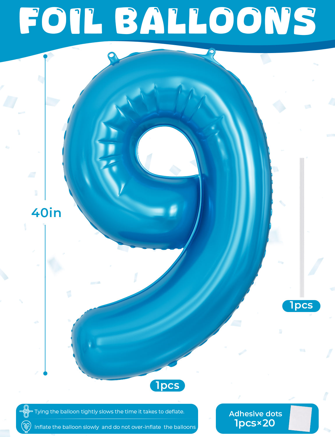- Blue Number 9 Balloon Set: You will get 1pc 40 inch foil number 9 balloon, 1pc straw, and 20pcs adhesive dots. The giant 40-inch blue balloon boasts a shimmering, eye-catching finish that shines brilliantly at any event, instantly becoming a charming focal point.