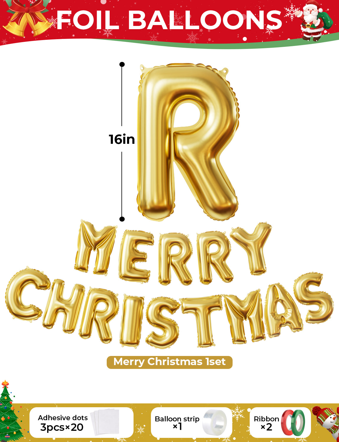 - Christmas Balloon Arch: Our 76 pcs Christmas balloon arch kit includes: sage green balloons (15 x 10", 5 x 5"), white balloons (10 x 10", 5 x 5"), red balloons (15 x 10"), gold balloons (10 x 10"), 1 red white candy cane balloon, 1 green gold candy cane balloon and 1 gold 'MERRY CHRISTMAS' balloon letters. Additionally, the kit includes 1 balloon chain, 1 red ribbon, 1 green ribbon, and 60 adhesive dots.