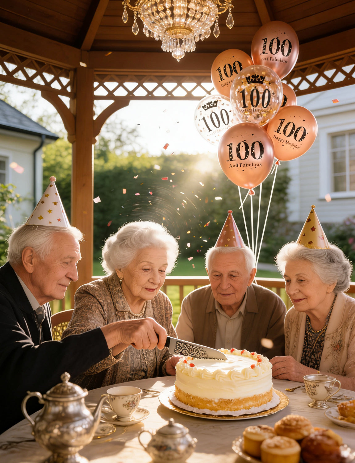 - Rose Gold 100th Birthday Balloons Decorations: These rose gold printed balloons are crafted from natural latex, making them thick, elastic, and long-lasting. The mix of metallic shine, soft pearlescent glow, and sparkling confetti creates a rich layered look—elegant yet modern. The warm rose gold tone adds sophistication and tenderness, perfect for celebrating her 100th milestone.